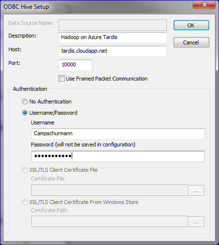 Open the File DSN you just created and click Configure. The ODBC Hive Setup and configure the host (e.g. [clustername].cloudapp.net) and authentication information (the username is what you had specified when you had created the cluster)