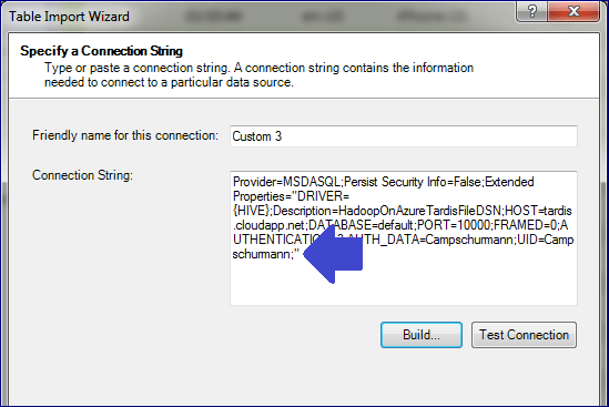 Note, after this dialog, verify that the password has been entered into the connection string that that has been built into the Table Import Wizard. Note, the blue arrow points to a lack of a PWD=<password> clause. If the password isn’t specified, make sure to add it back in.
