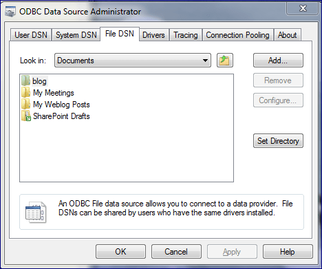 Go to the ODBC Data Sources Administrator and click on the File DSN tab.