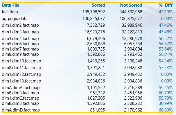 How data is sorted significantly impacts the Analysis Services Multidimensional (SSAS) engine’s ability to compress the data. For example for fact.data, there is a 43% difference in size when the data was sorted vs. not sorted. When you are working with very large cubes, this difference translates to terabytes of wasted space. Because the SSAS engine can be disk I/O intensive, more disk space impacts query and processing performance as well.
