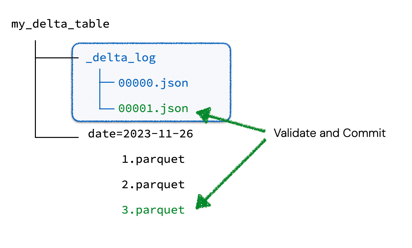 Note, while the data file (3.parquet) was created in this stage, the transaction log (00001.json) has not been created yet. Therefore, if any user reads the table in this moment, because the transaction log has not been created, when following the Delta protocol, that user will not read 3.parquet.